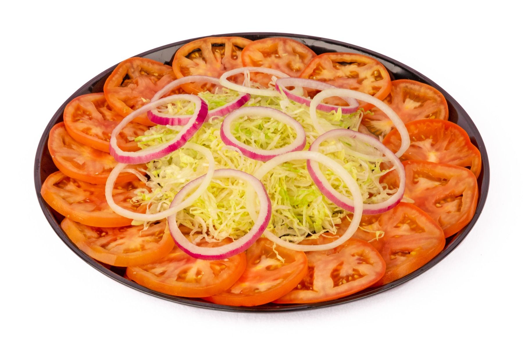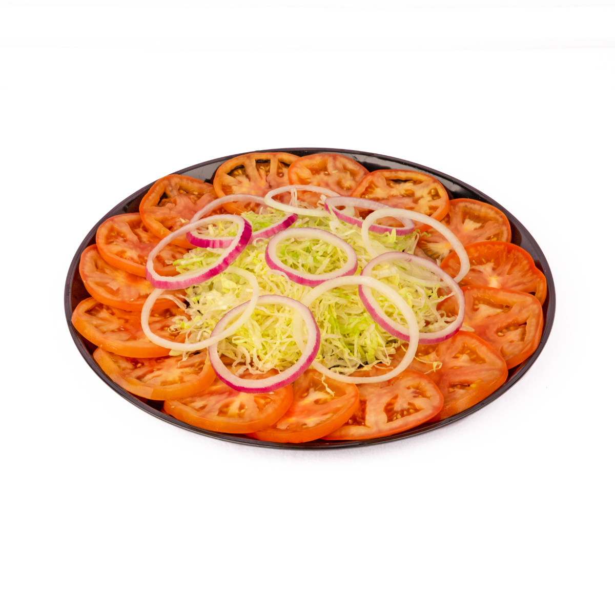 Includes 16 slices of tomatoes, sliced onions, and shredded lettuce arranged on a platter